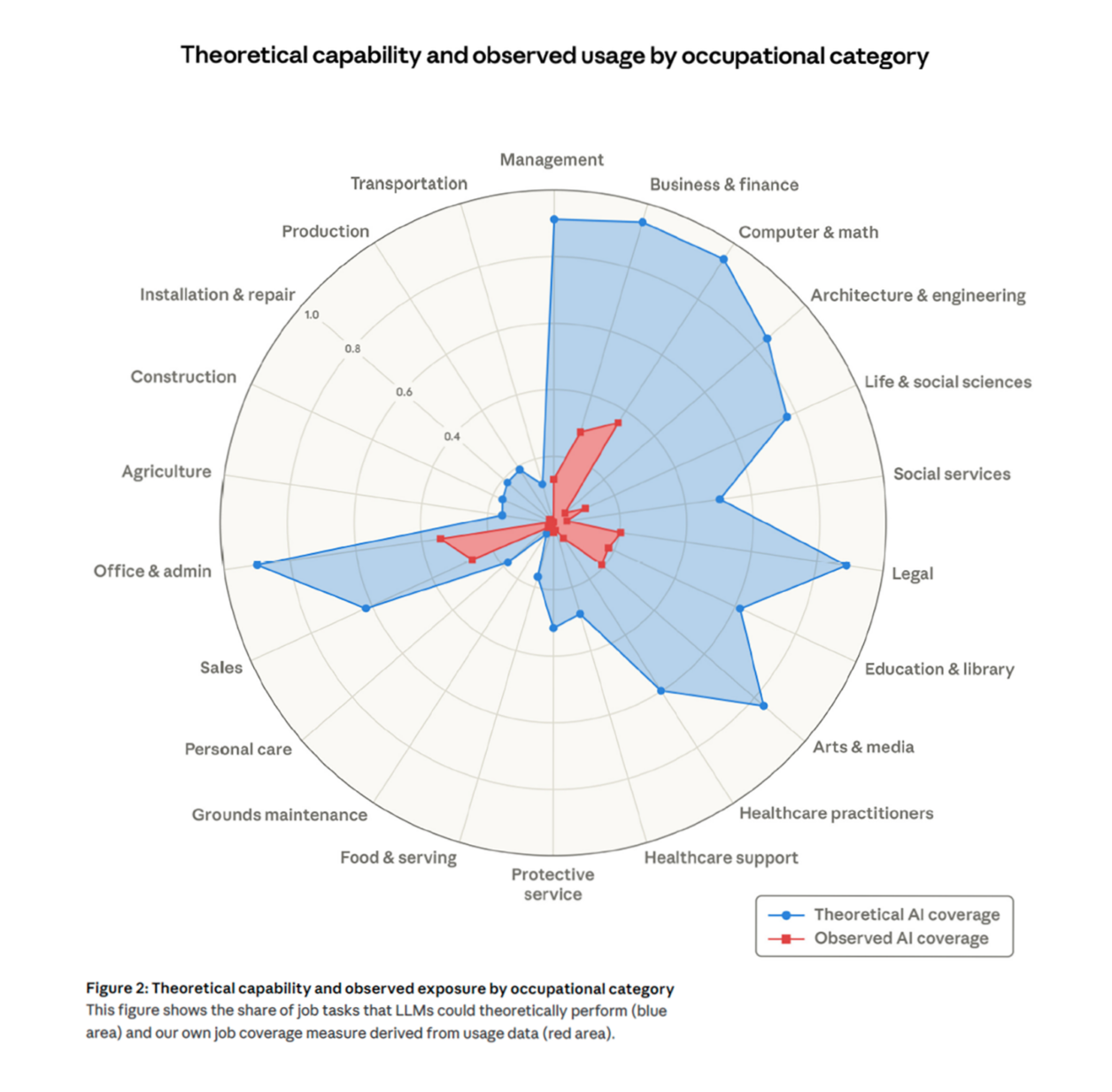A chart from Anthropic’s research arm shows the gap between what AI is theoretically capable of doing across occupations and how much it is actually being used — a gap that is wide for now, but may not stay that way; image courtesy of Anthropic